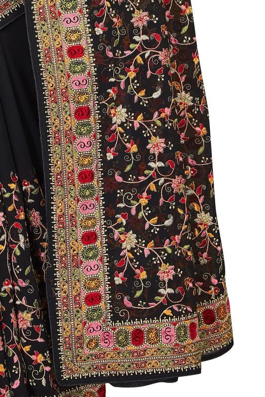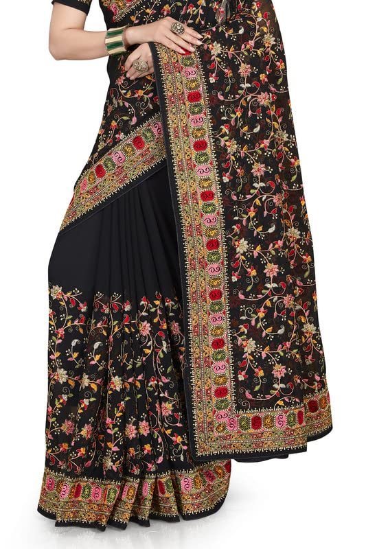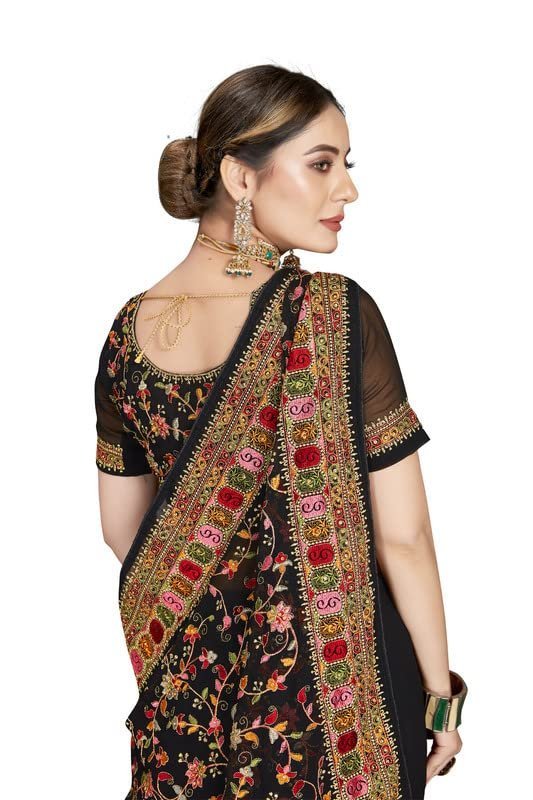 Home Saree Black Kashmiri Resham Heavy Embroidered Border Work Georgette Saree Sari with Heavy Work UnStitch Blouse Piece For Women & Girls